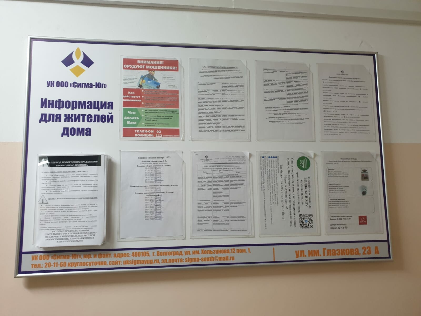 в Центральном районе по ул. им. Глазкова, 23 «А», дом постройки 2018 г., перешел на обслуживание в УК «Сигма-Юг» с января 2021 г. от аффилированной Застройщику УК «ВолгаЖилСтрой» |